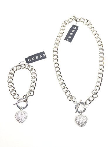 -. Title : Set of Two Guess Silver Tone Bracelet and Necklace Puffed Heart Charm with Rhinestone-new