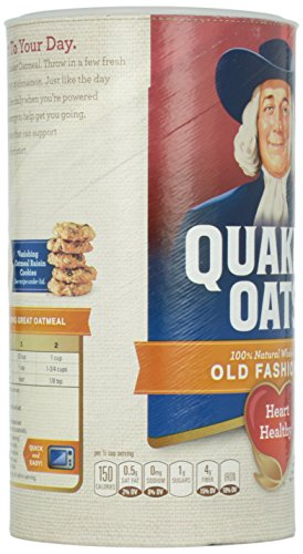 -. Binding : Grocery -. Brand : Quaker -. EAN : 0030000010204 -. Feature : Quaker Old Fashioned Oatmeal is made from just ONE ingredient - 100% whole grain Quaker Oats / Helps keep you full through the morning (serve with 8 ounces of skim milk) / Heart healthy whole grains: Can help reduce cholesterol when part of a heart healthy diet (3g of soluble fiber daily from oatmeal, in a diet low in saturated fat and cholesterol, may reduce the risk of heart disease) / Sodium Free / Make breakfast while you sleep by trying a delicious Quaker overnight oats recipe -. Label : Quaker -. Manufacturer : Quaker -. ProductGroup : Pantry -. ProductTypeName : GROCERY -. Publisher : Quaker -. ReleaseDate : 2014-04-24 -. Size : 8 Ounces -. Studio : Quaker -. Title : Quaker Oats Old Fashioned Oatmeal, 18 oz Canister -. UPC : 030000010204
