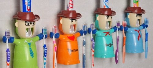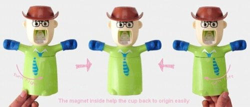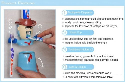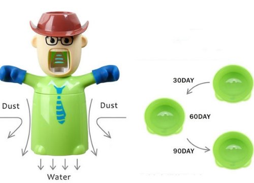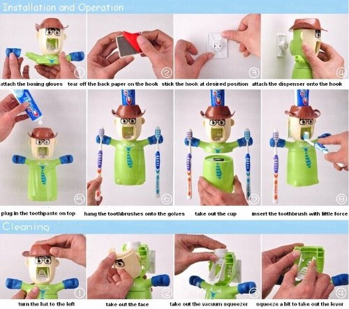 - Feature : Cute cartoon character brightens up your morning and cheer you up all day / Kids start to love toothbrushing / No batteries required, can help you use up the last bit of toothpaste, a GREEN product No need to handle irritating tube / Keeps your bathroom tidy and clean / Comes with a attached adhesive pad for easy installation