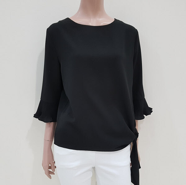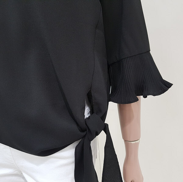 예쁜주름이 잡힌 나팔모양의 소매가 모던한 여성스러운 세련미가 돋보입니다ㆍ허리한쪽부분 매듭할수있는 포인트로 와이드팬츠ㆍ스커트ㆍ캐쥬얼스타일 어디에도 코디연출가능합니다
