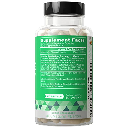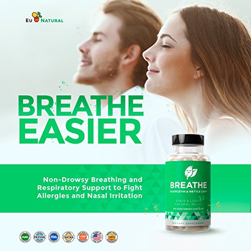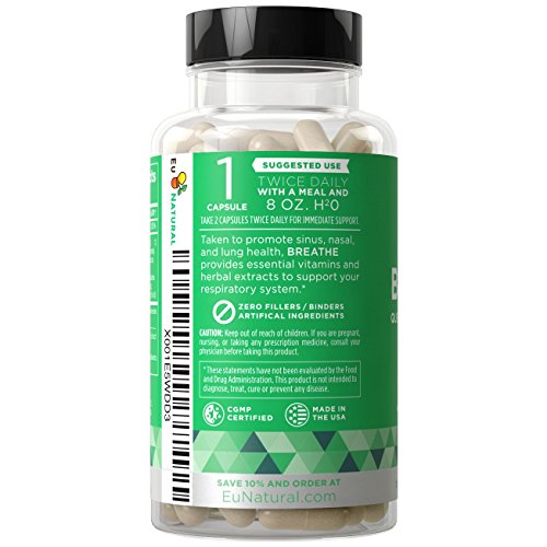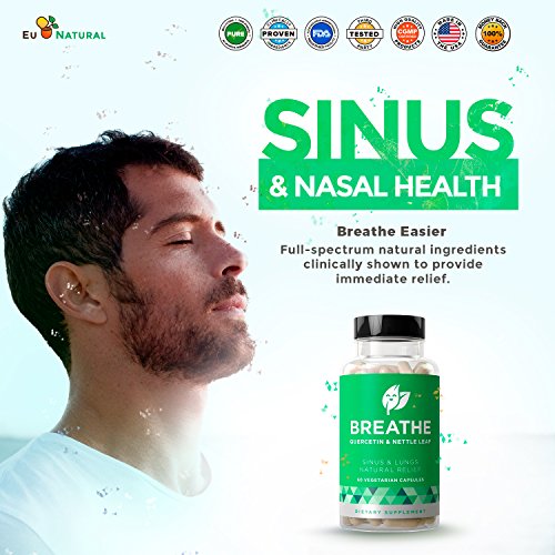 BREATHE SINUS & LUNGS RESPIRATORY RELIEF by Eu Natural is packed with clinically-researched ingredients like Quercetin, Nettle Leaf, Boswellia, and Butterbur Extract that provide long-term support by focusing on the root cause of nasal and lung irritation instead of masking symptoms.