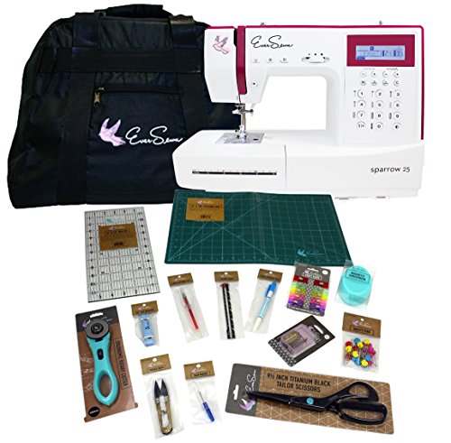 -. Feature : The computer-controlled EverSewn Sparrow 25 is the top model in the Sparrow series. / It offers everything a creative sewer could need, at a very attractive price/performance ratio. / The Sparrow 25 boasts 197 stitch patterns in total, including 1 alphabet, 7 buttonholes, and 1 eyelet stitch. Decorative stitches can be set up to a width of 7 mm, as desired. The memory function allows individual stitch combinations to be saved. In addition to features such as the slide speed control, start/stop function and needle stop up/down. / Sewing Bundle Includes: EverSewn Sparrow Sewing Machine Tote and the EverSewn Sewing Starter Kit