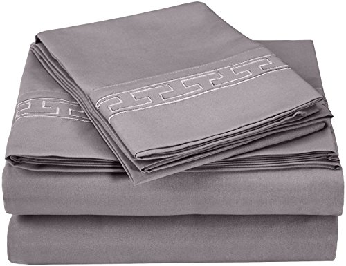 Superior Regal Greek Key Embroidered Sheets, Luxurious Silky Soft, Light Weight, Wrinkle Resistant Brushed Microfiber, Queen Size 4-Piece Sheet Set, Silver
