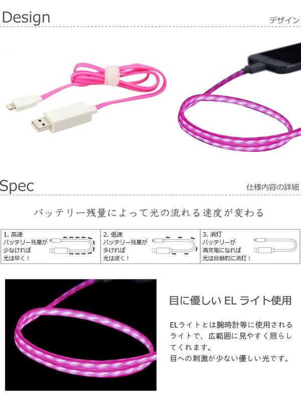 光の流れる速さでバッテリー残量がわかる、光るライトニングケーブルです!!目に優しいELライトを使用しており、広範囲に見やすく照らしてくれます。