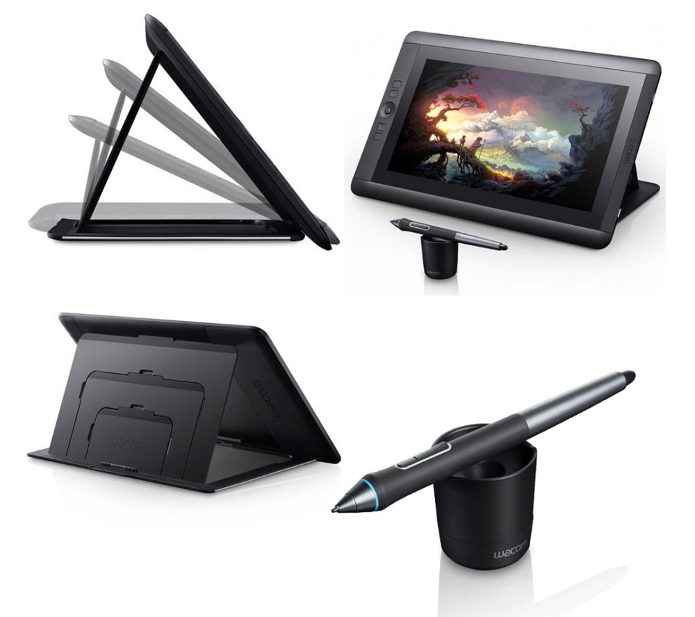 The Cintiq 13HD can be used flat on the desktop, held at three different angles with the included stand, or you can rest it on your lap.
