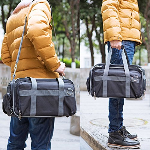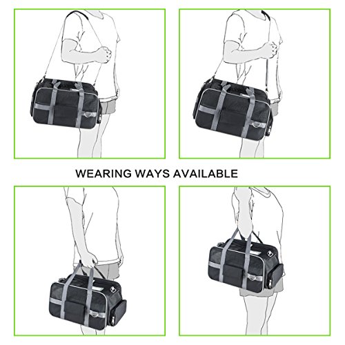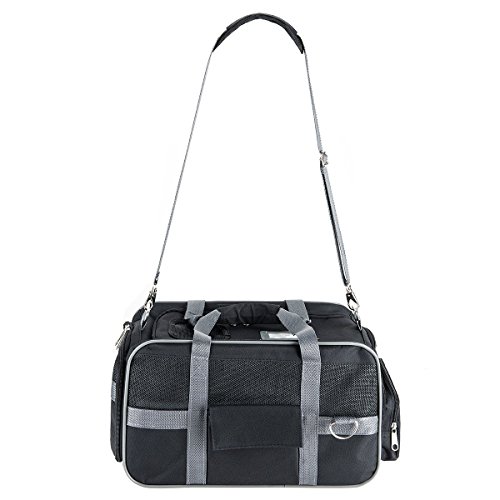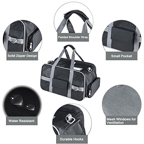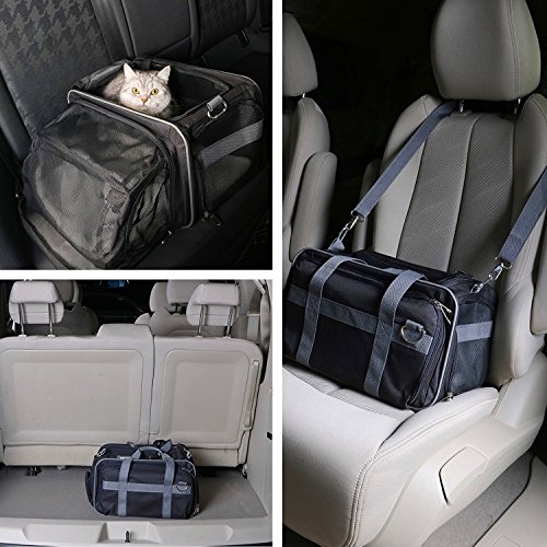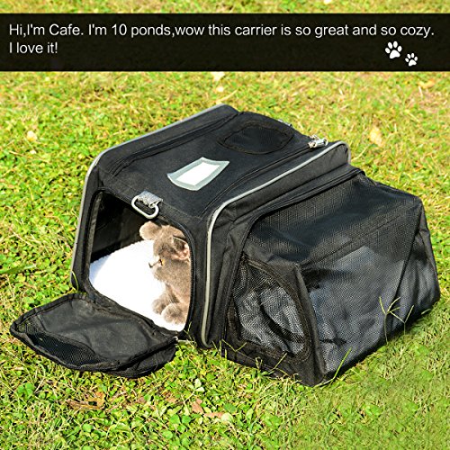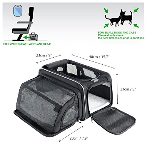 -. Feature : [Dimension & Compatibility] 15.7" x 9" x 9" with high capability to hold up to 19.8 lb pet;Ideal for cat,kitty,kitten,rabbits and other small animals / [Expandable Space] Interior expandable to larger size 17" x 15.7" x 9" for more activity and stretching room, also a portable bed for pet,flat folding available / [Multi Suitable] Suitable for airline cabin with shoulder handy strap or underseat, meanwhile fixed on the headrest of the cars, SUV, etc.for travel with your loved pet; Easy to clean and side pockets help with extra storage space for pet treats and vet visit,interior padded fleece for your pet comfort / [Breathable & 3 Sides Zipper Design] 3 sides breathable mesh window and canvas mix guarantee the comfort breath, air circulation and look through, top and sides solid zipper design enable the convenient in and out for pet / [Premium Quality & Portable] With high quality light nylon fabric made carrier, an adjustable shoulder strap, suitable for pets of different sizes, effort saving, easy to carry, and 1 year warranty