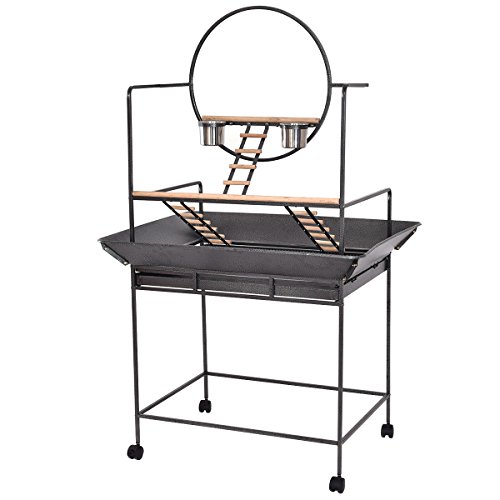 Specification: Color: Black Material: Stainless Steel, Powder-Coated Metal, Wood Overall Dimensions: 39.5" L x 30" W x 66.5" H Net Weight: 31lbs Package Includes: 1 x Bird Playstand