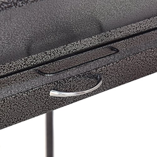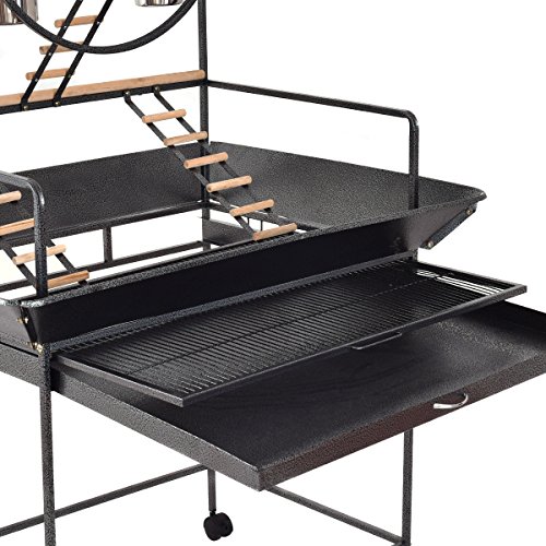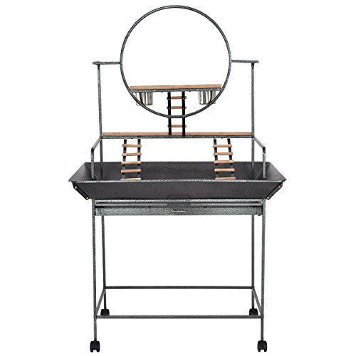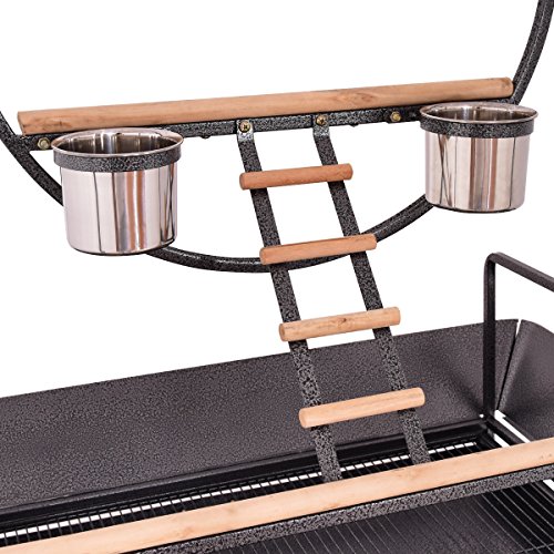 Features: Solidly built with stainless steel, powder coated metal and wood construction for durability Metal play ring in center, multiple wooden perches for resting plus 2 stainless steel bowls for food and water 3 ladders increase interest Easy and quick cleaning with the pull-out drawer and the rounded corner seed guard 4 swivel wheels (2 lockable) for easy transport around the house
