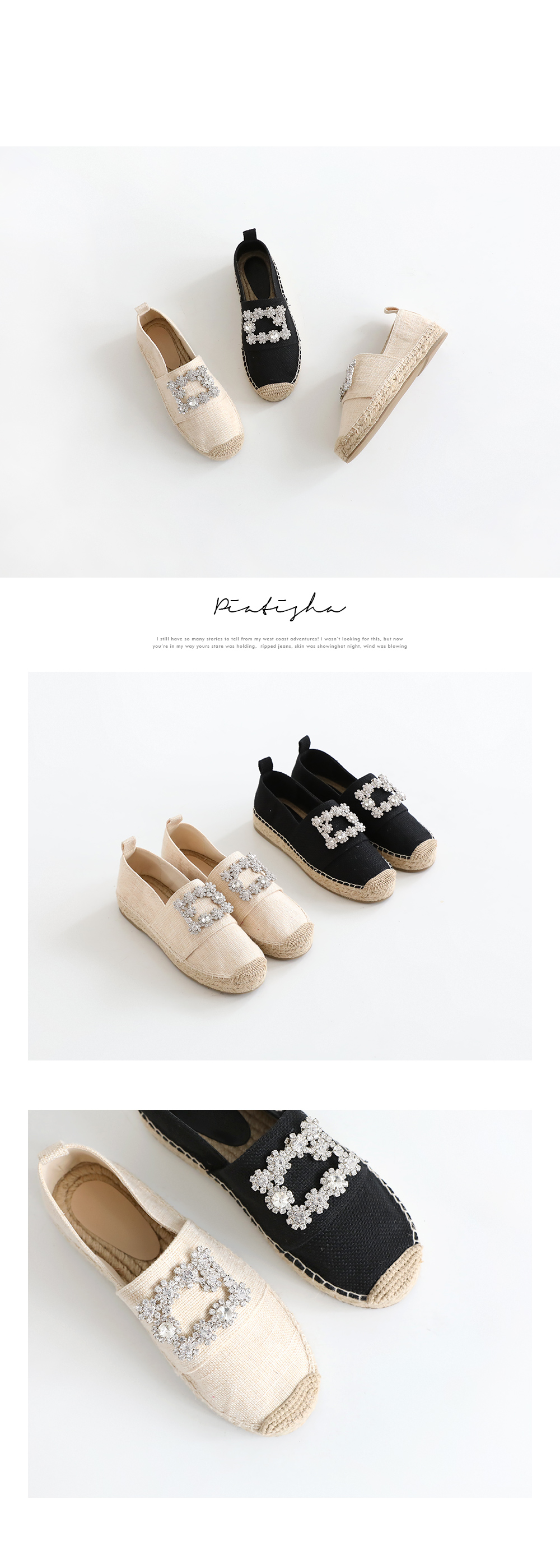 수수한 디자인에 발등에 볼드한 큐빅디테일을 더하여 조금 더 특별한 느낌으로 착화됩니다. 린넨소재와 에스파드류 아웃솔이 만나면서 자연스럽게 연출되는 분위기가 멋스럽습니다.