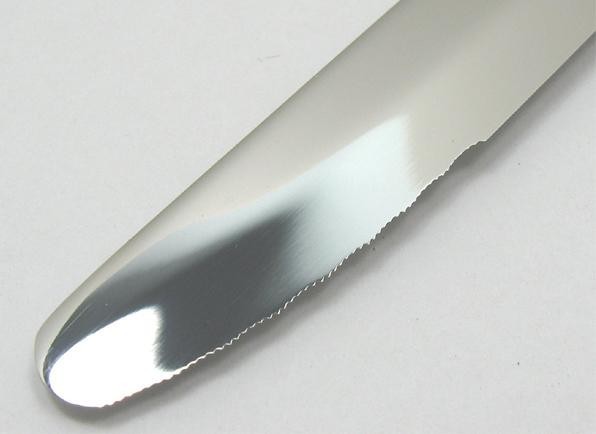 軽いタッチで良く切れるステーキナイフ。W波刃(波刃の中に、更に細かいギザ刃)だから、先端部がつぶれても少しでも刃先が食い込めば切れます。握りやすい柄の部分には強化P.P.樹脂を使用。木製ハンドルと比べ、衛生的で長持ちします。 |