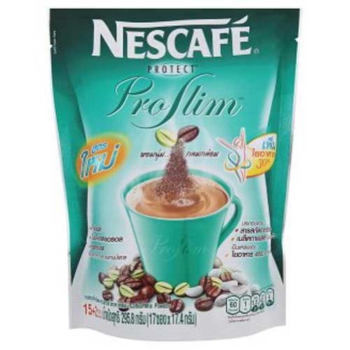 -. Binding : Misc. -. Brand : SMILE LANNA SHOP -. EAN : 8859055187950 -. Feature : Coffee and tea products to keep you entertained and enjoy the velvety / Smooth Columbian coffee genuine. And a mixture of beans and extract it inulin fiber / To help your digestive system work better. / White beans contain the particular phaseolamin, which is an inhibitor of alpha-amylase, an enzyme that allows the transformation of starch into sugar in the intestine. This protein is effective as a dietary supplement designed to fight against excess weight. / A blend of roasted and green coffee bean with nutrition from white kidney bean extract and dietary fiber giving you a real taste of coffee and a slimming body. -. LegalDisclaimer : Guarantee 100% Genuine Product / World Wide Shipping /Ships from and sold by Variety ETC. -. ProductGroup : Grocery -. ProductTypeName : GROCERY -. Title : Nescafe Protect Instant Coffee 3 in 1 Proslim Diet Slimming Coffee 15 Sachets