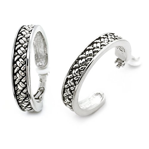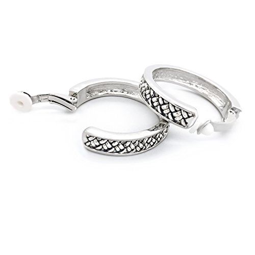 Made of rhodium plated alloy, these hoops are showcasing a vintage antique look with braided rope along the length of each hoop. Measures about 6mm wide with diameter of 1.25" and secured with clip on backings. These fashion clip on earrings will make the perfect choice for your special someone for Valentine's gift, Christmas gift, Mothers day gift, Birthday gift, Anniversary Gift, or Bridal party gifts.Feature