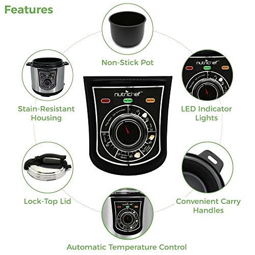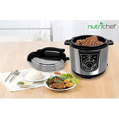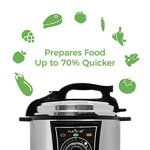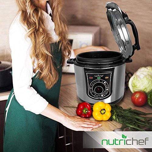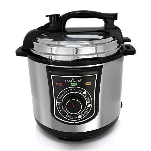 The NutriChef Electric Pressure Cooker provides you with convenient food prep ability. Cook smarter and prepare food up to 70% quicker than using traditional cooking methods. Bake, steam, boil or braise food faster than ever! The enclosed pressure cooking system combines a high-powered heating element that helps keep a constant and consistent cooking temperature. Use the front panel rotary control dial to adjust time settings -- or activate the 'Keep Warm' function to keep meals ready-to-serve. Your food will keep all of their natural flavors and juices, while retaining beneficial nutritional value. Reduce, or even eliminate, butter and oils for tasty meals the whole family will enjoy! The integrated pressure safety valve and lock-top lid ensure thorough cooking, making each dish time & energy efficient. The non-stick teflon coated inner cooking pot is removable for easy serving and cleaning. Enjoy convenient kitchen style with the NutriChef Electric Pressure Cooker.