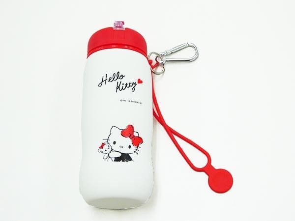 | キティちゃんのイラストが可愛いシリコーンボトル。飲み終わった後は、丸めて付属のストラップで留めればとってもコンパクトに!カラビナ付きですので、カバンなどに付ける事もできます。 |