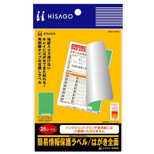 地紋入りで透けない再剥離タイプの目隠しラベルです。地紋入りなので面倒な印刷の手間はいりません。 ※サプライヤー直送品 ご注文後、当日~1営業日後の出荷となります【商品名】OP2405 ヒサゴ 簡易情報保護ラベル はがき全面 25枚×3セット A6(105×148.5mm)