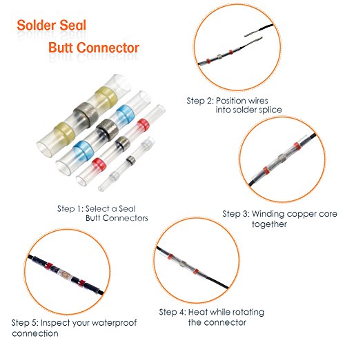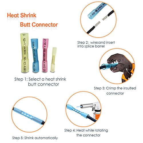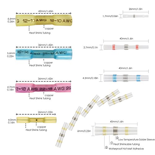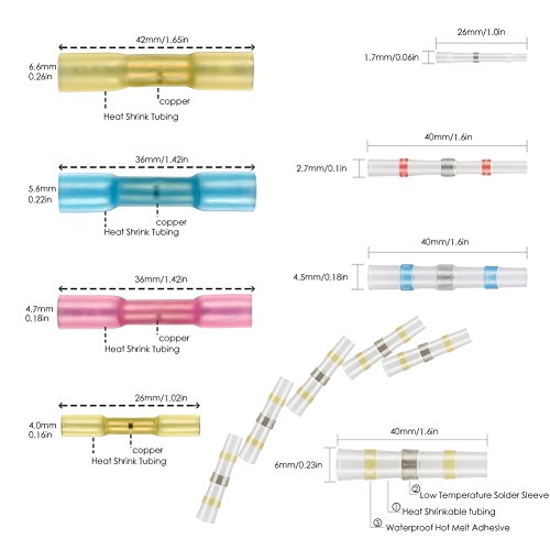 ?Features: Shrinkage ratio 3:1 Wire gauge imprint on connectors Translucent heat shrink tubing provides high tensile strength as well as resistance to stretch and mechanical damage resistance. Perfect for marine and automobile applications. An easy one step connection of wires. Ideal for Soldered, insulated and sealed. Melt adhesive in inside Solder and seal and with advanced waterproof function.
