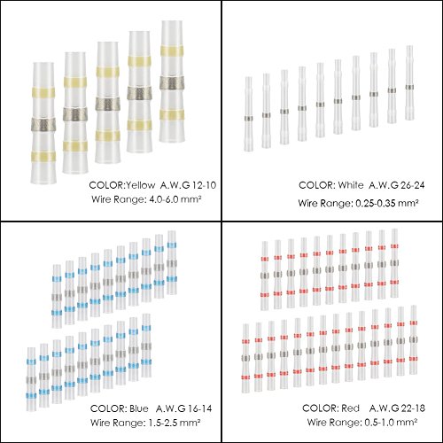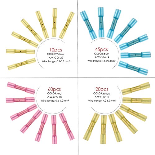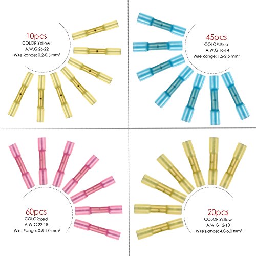 135 PCS Heat Shrink Wire Connectors Size: 10 X Yellow connector: Suits cable/ wire sizes 0.2-0.5mm² 26-22 GA 60 X Red connector: Suits cable/ wire sizes 0.5-1.0mm² 22-18 GA 45 X Blue connector: Suits cable/ wire sizes 1.5-2.5mm² 16-14 GA 20 X Yellow connector: Suits cable/ wire sizes 4.0-6.0mm² 12-10 GA