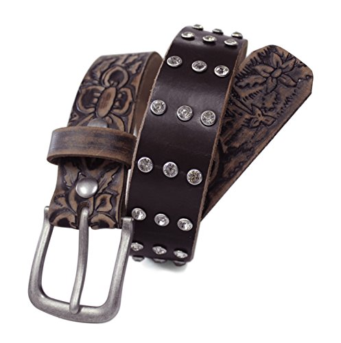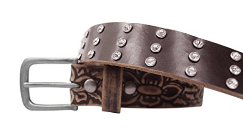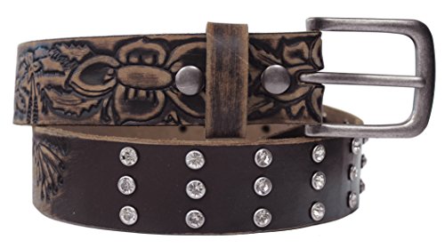 Toneka Ladies Western Rhinestone Studs Vintage Distressed Embossed Floral Pattern Brown Genuine Full grain Leather Belt - This vintage distressed western belt showcase Midwest floral embossing and rhinestones studs through-out the belt. Accompanied by a single prong brushed nickel removable buckle. Genuine cowhide full-grain leather with slight blemishes, wrinkle, texture, marks and color gradation adds to its unique characteristics. Solid full-grain leather rich texture makes it durable and resilient. The leather will age gracefully and become smoother and supple with time. The belts are measured from the line between the buckle and the leather to the middle hole at the other end plus six inches to get the total strap length. Choosing the correct belt size: the belt size needs to be 1" larger than your waist size to give allowance for your outfit. The two button snaps makes it easy to change the buckle depending on the on the occasion and match your wardrobe. Depending on the type of buckle the length can be extended up to 2 inches;.Feature