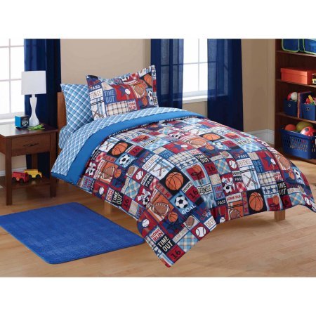 Product Description Incorporate style and fun into your child's sports themed room with this Mainstays kids' bedding set. It features patches of varying sports throughout the comforter in neutral colors. This stylish and practical bedroom bedding set is made of 100-percent polyester with 100-percent polyester filler. It is soft and comfortable, and it will keep little ones warm throughout the night. This Mainstays kids' bedding set is available in twin and full sizes to suit all your bedding needs. Each set includes a comforter, flat sheet, fitted sheet, standard pillow case(s) and standard pillow(s) sham. It is machine washable for easy care. 0