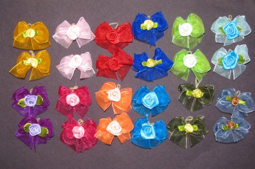 -. Binding : Misc. -. Brand : JJ Couture -. Color : Variety -. EAN : 0852659854202 -. Feature : Aproximately 1 to 1.5 inches / A total of 24 dog bows per pack / Great dog bows for groomers and pet owners -. Label : PET Expressions GA -. Manufacturer : PET Expressions GA -. MPN : 4507 -. NumberOfItems : 24 -. PackageQuantity : 24 -. PartNumber : 4507 -. ProductGroup : Pet Products -. ProductTypeName : PET_SUPPLIES -. Publisher : PET Expressions GA -. Size : s -. Studio : PET Expressions GA -. Title : 24 Dog Hair Bows - Double Layered with Center Rose Decorations - 12 Pairs of Different Colors- Handmade -. UPC : 852659854202