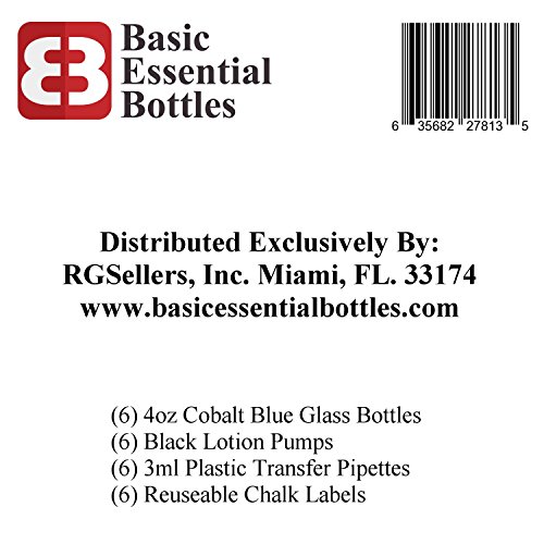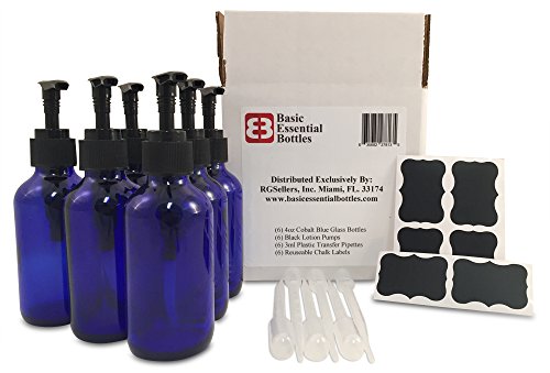 (6) 4 Ounce 4 oz Empty Cobalt Blue Glass Bottles W/black Lotion Pump Tops (6) 3ml Pipettes (6) Chalk Labels for Oils, Cleaning Products, Aromatherapy, Shampoo, Lotions, Soaps, etc.