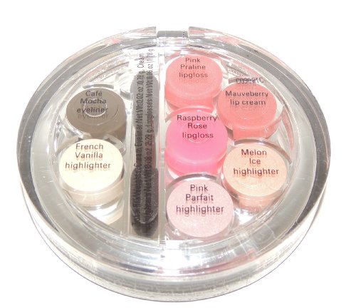 -. Feature : cafe mocha eyeliner / french vanilla highlighter / pink parfat highlighter / melon ice highliter / pink praline, mauveberry, & rasberry rose lipgloss