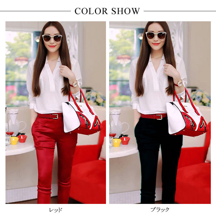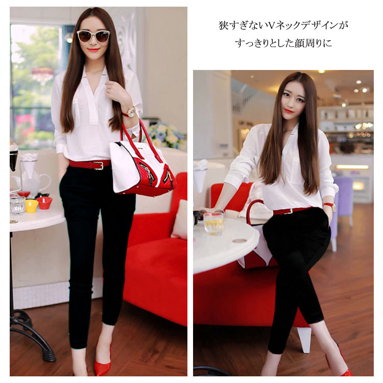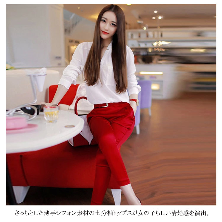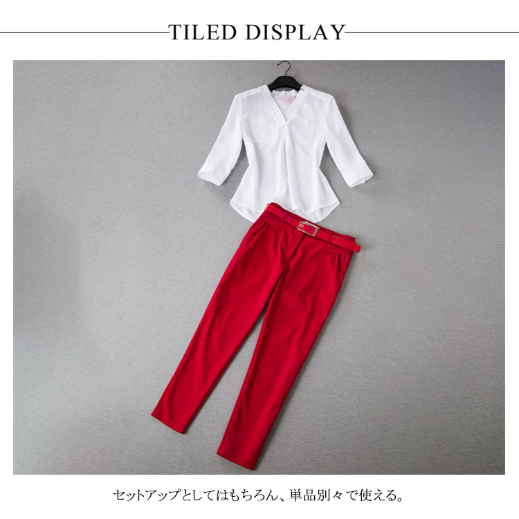 | 大人女性にぴったりな上下2点セット。さっらとした薄手シフォン素材の七分袖トップスが女の子らしい清楚感を演出。狭すぎないVネックデザインがすっきりとした顔周りにセットアップとしてはもちろん、単品別々で使える。 | |