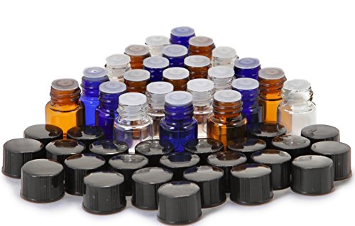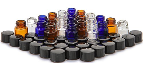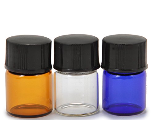 - 24 - 1 ml Assorted Colors (Clear, Amber, Cobalt Blue) Glass Bottles with Orifice Reducers and black caps