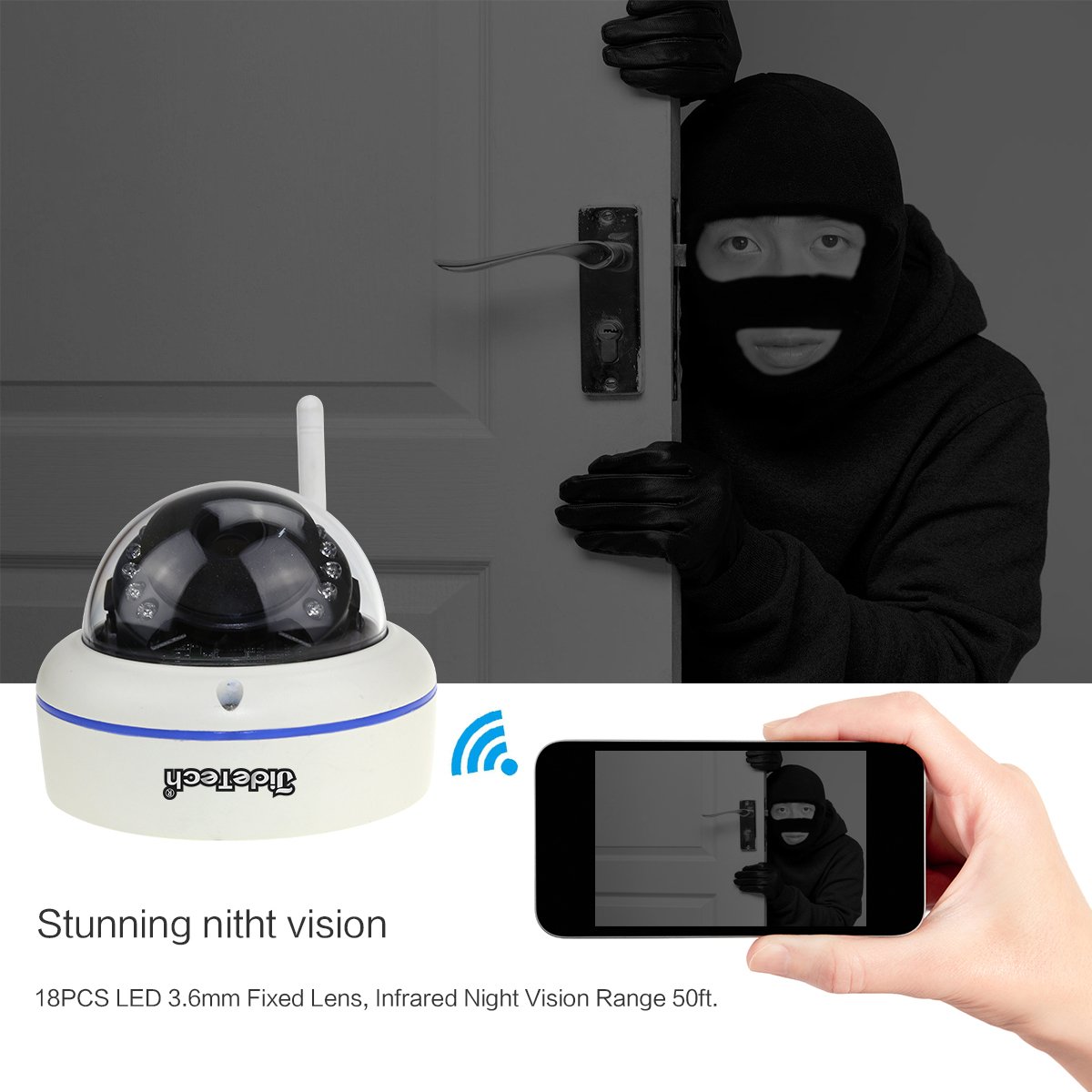 With 18 infrared LED lights, you can shoot pictures of about 15 m ahead in true darkness, letting the eyes of crime prevention flash.