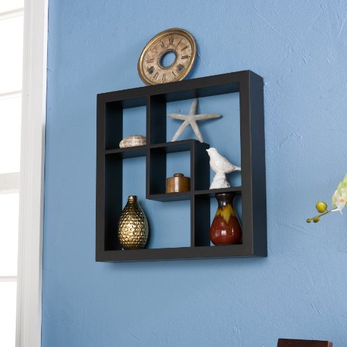 - Feature : 16-inch w by 3-inch d by 16-inch h; 5 display compartments / 3 compartments measuring 4-1/2-inch w by 3-inch d by 4-1/2-inch h / 2 -inchl-inch shaped compartments measuring 9-1/4-inch w by 3-inch d by 9-1/4-inch h / Easy as hanging a picture; No visible screws, connectors, or tracks / Black finish; constructed of painted and laminated mdf; maximum weight capacity is 10 lbs