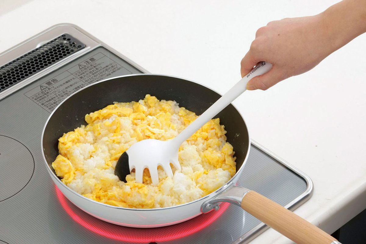 ● Turner with stir fry with 8 fingers facing downwards.