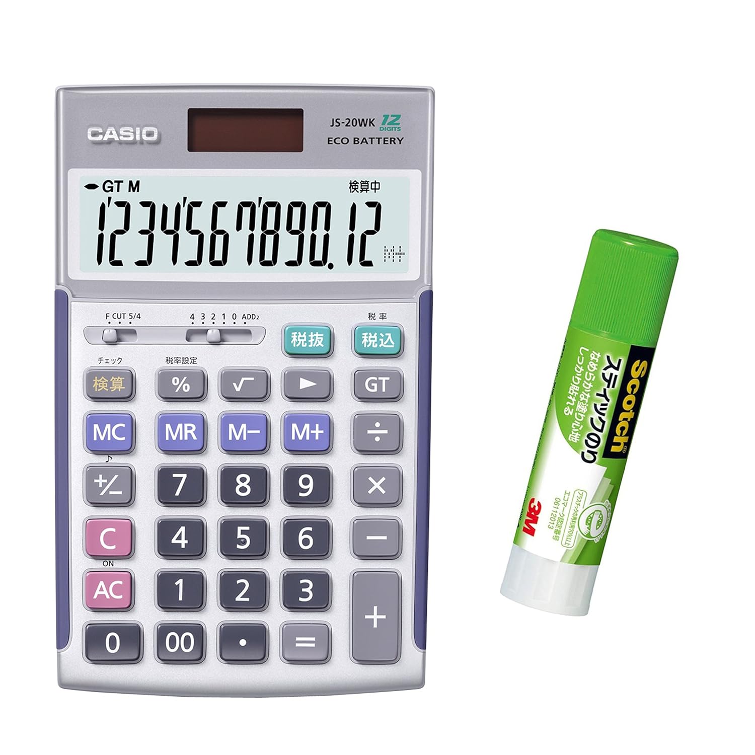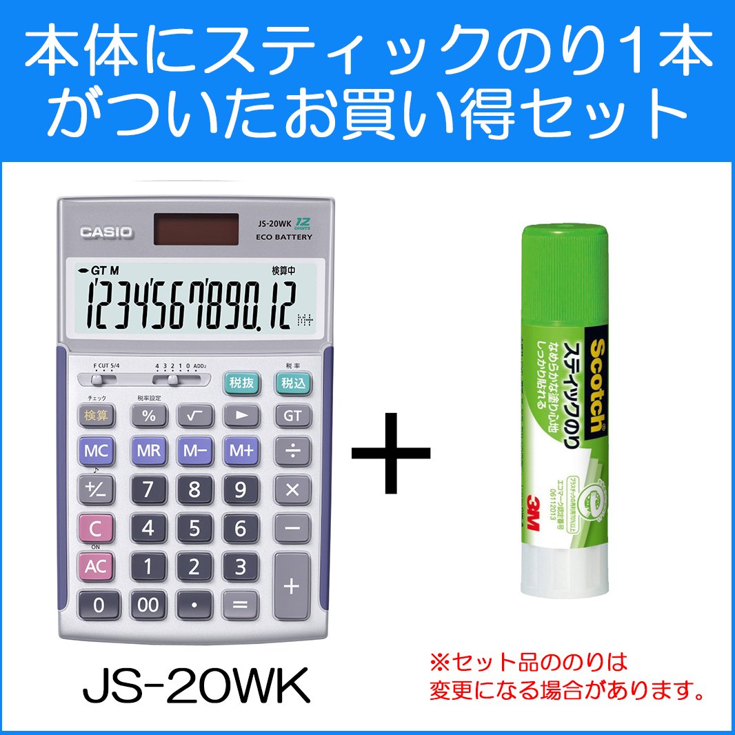 【セット内容】本体(JS-20WK)+スティックのり1本 早打ち対応! 2キーロールオーバー 【桁数】12 【大きさ(奥行×幅×高さ)mm】174.5×107×24.2 【質量(g)】60 【税計算】消費税の税込・税抜計算が行える。税率も自由に設定でき、税金額も表示する。【検算】計算時に入力ミスを音で知らせる。 【T・W・P(太陽電池と補助電池の併用)】 従来の太陽電池付き電卓と異なり、計算途中で光がさえぎられても、内蔵電池によって計算内容を保護。