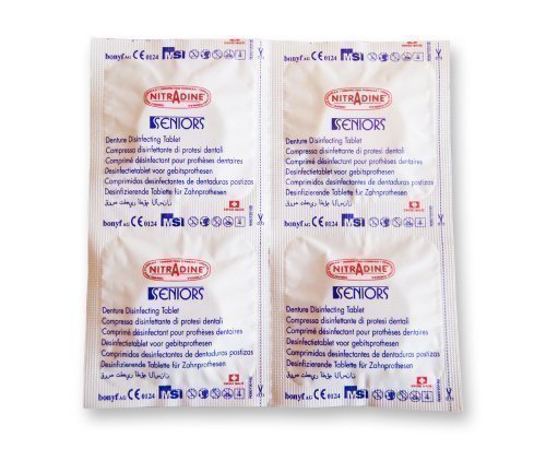 -. Feature : Patented disinfecting tablet for cleaning dentures, retainers and other removable dental appliances. / Buy nitradine to clean & disinfect : acrylic dentures & plates, metal chrome dentures, flexible dentures, orthodontic appliances, bite guards & other dental appliances / Works effectively after only 15 minutes on all types of removable dental appliances. / Recommended dosage : one tablet two times per week. / This is a sample listing four tablets supplied