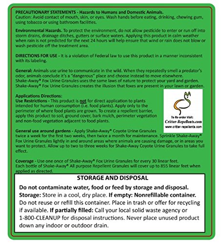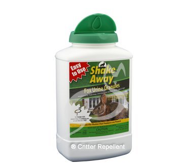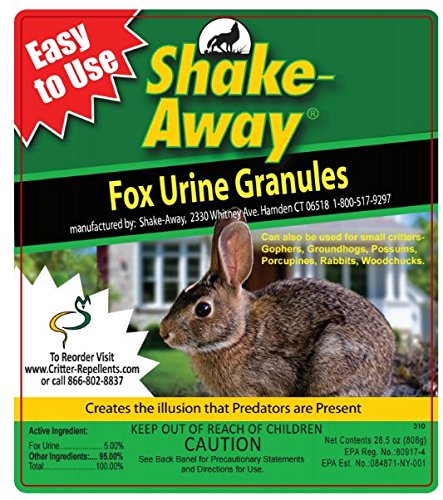 -. Title : Shake-Aways All Natural Small Critter Repellent for Rabbits, Gopher, Groundhogs, Possum, Porcupines, Woodchucks other small animals (Fox Urine Granules) 28.5 oz size - New EZPour Bottle & Cap