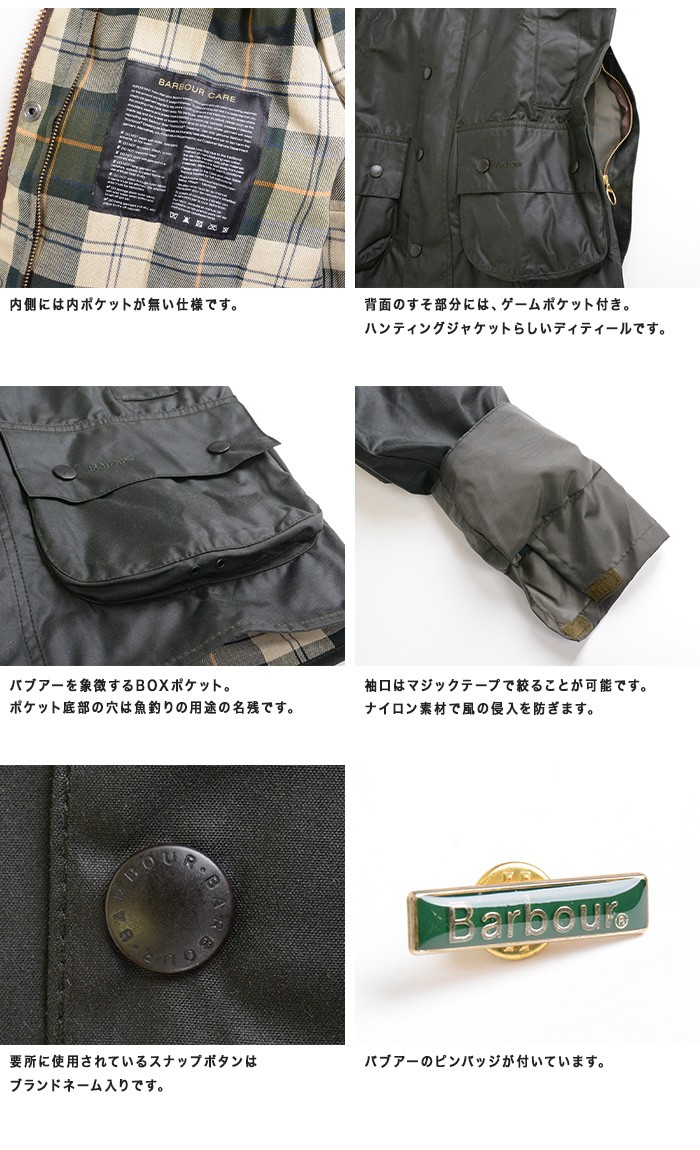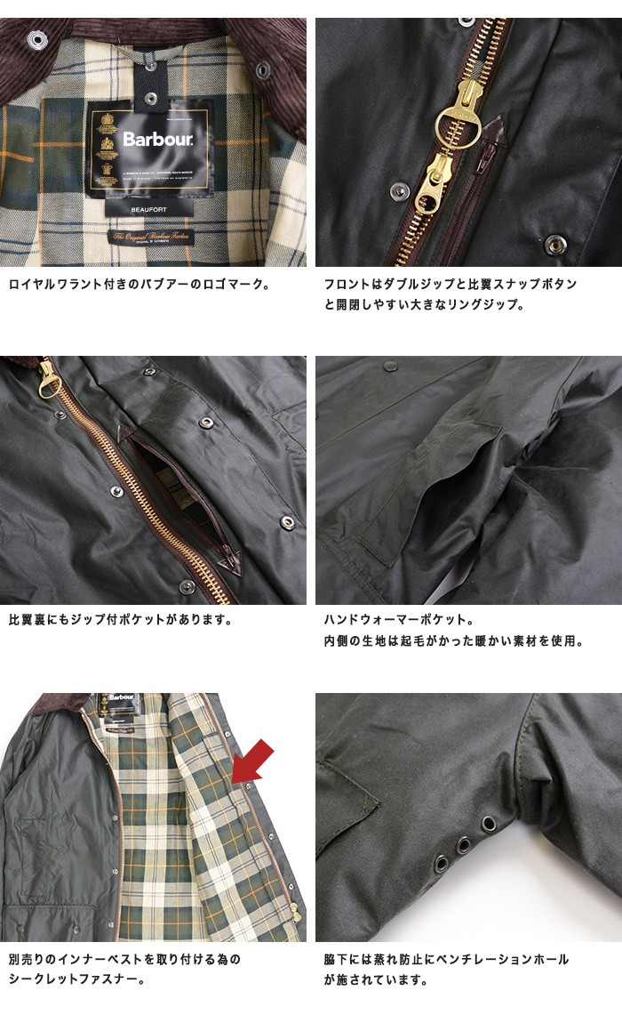 | 商品詳細 | ●BARBOUR(バブアー) 1894年イングランドで創業したバブアー社。エジプト綿にソーンプルーフ・ドレッシングという独自のワックスを塗布する加工技術によって、高機能のアウター・ジャケットを生み出したことで知られています。英国軍潜水艦の公式ユニフォームとして採用され、また数々の著名人に愛用されています。その高い技術によって生み出される製品は、英国王室のお墨付きです。ビューフォートは元々はハンティング用ジャケットとして開発されたモデル。ソーンプルーフオイルドコットン仕様で、背面の大きなポケットが特徴です。 | ||