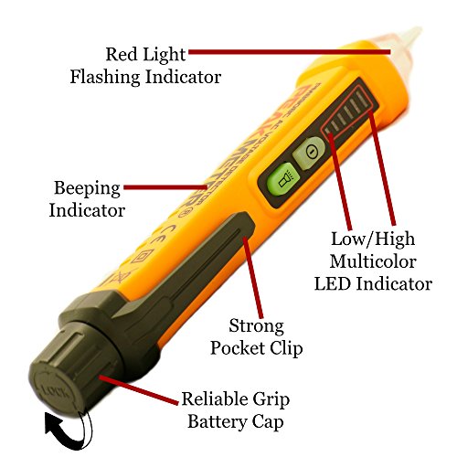 - ★ CLEAR & UNMISTAKABLE – When AC voltage detected, alarms provided by multi-color LEDs, flashing red voltage indicator lamp, and beeping alarm. The higher the voltage, the higher the audible alarm frequency and rate of flashing lights – great, even in noisy environments. Makes it hard to miss a live wire. Detects AC voltage between 12V and 1000V divided into 3 distinct voltage levels.