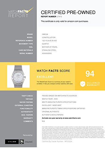 -. Feature : Omega Constellation 123.15.24.60.05.003 with mother-of-pearl dial / Authenticated by WatchFacts. Grade Rating: 94 / Condition: Excellent / Comes with original box and manufacturer's papers offered with this watch / Quartz movement / Watch year: 2000