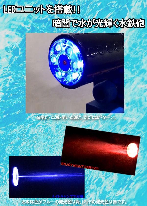 LEDユニットを搭載した、暗闇で水がレーザー光線のように光り輝く水鉄砲です。ナイトキャンプ、ナイトイベントなどで目立っちゃえ!! |