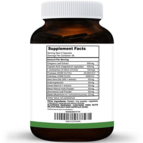 NATURAL NON-GMO HERBS: Our Candida Cleanse is NON-GMO, so you can feel safe knowing you aren’t putting harmful GMOs into your body. 630mg of powerful NON-GMO herbs include Oregano Leaf Extract, Wormwood Leaf Powder, Protease, Cellulase, Caprylic Acid, L. Acidophilus, Aloe Vera Gel, Arabinogalactan, Anise Seed, Black Walnut Hulls Powder, and Reishi Mushroom.