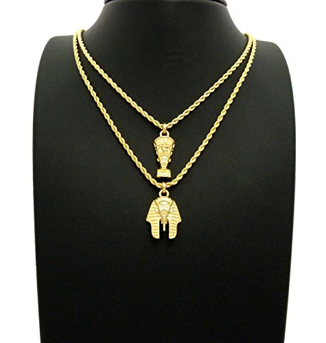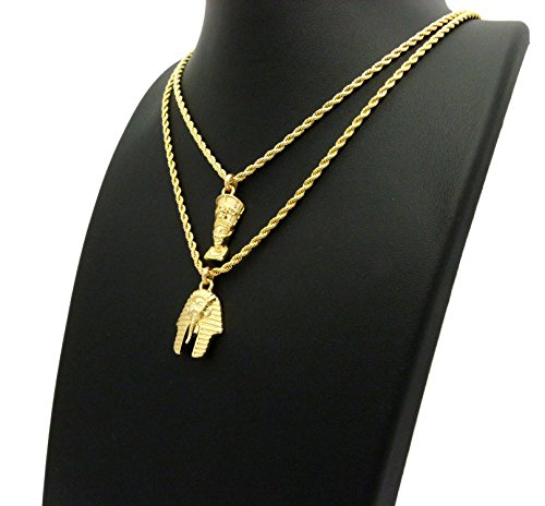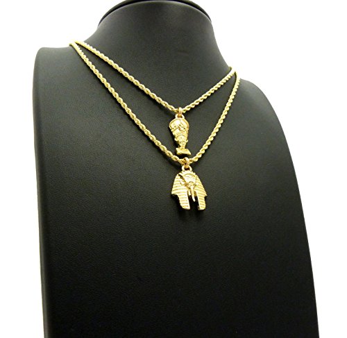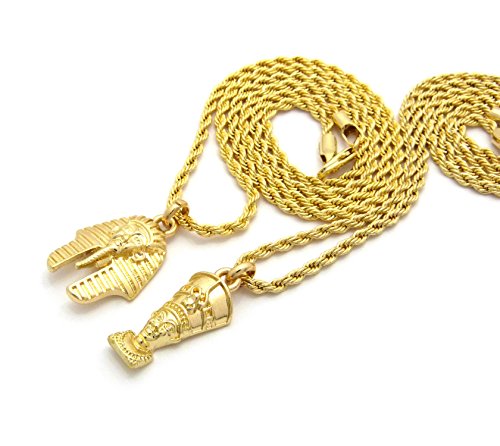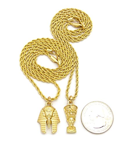 -. Feature : Egyptian Mini Size Pharaoh King, Nefertiti Pendant 20",24" Rope Chain 2 Necklace Set in Gold Tone / Nefertiti: 0.35" x 1.0", 2mm 20" Rope Chain / Pharaoh: 0.75" x 1.1", 2mm 24" Rope Chain / Fashion Costume Jewelry / Imitation Gold Color Plated