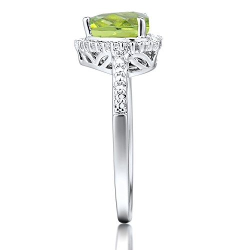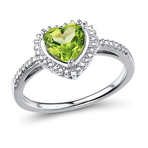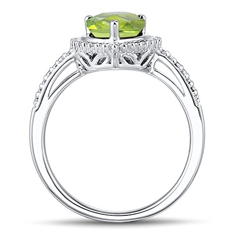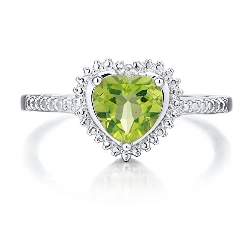 -. Feature : Charming Heart Shape Ring / 7 MM Heart Shaped Peridot (occasionally oil treated) / 1 Round Diamond Accent .002ct / Silver Beading Accents on Halo and Shank / Rhodium Plated Sterling Silver