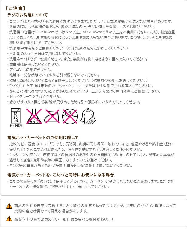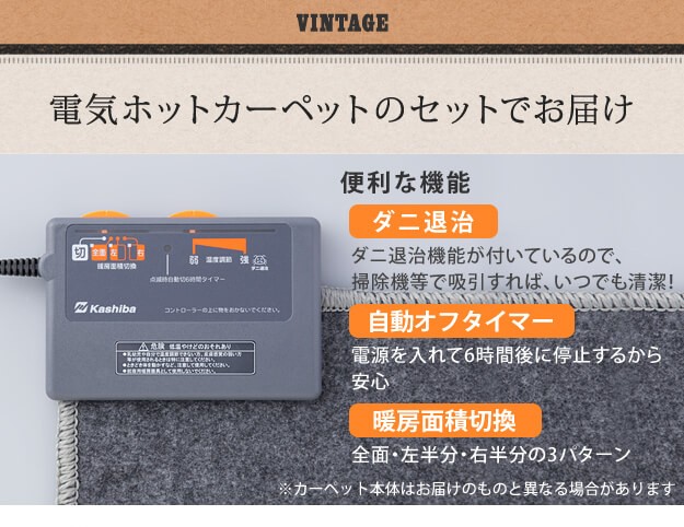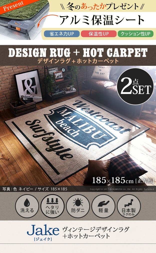 ※メーカー直送のため代金引換はお受けできません。※沖縄・一部離島は別途送料がかかります。お見積もりいたしますのでお問い合わせ下さい。【セット構成】カバーx1ホットカーペット本体x1【カラーバリエーション】グレー・ネイビー【仕様】■カバー本体:ポリプロピレン100%耐熱・防ダニ加工床暖房・ホットカーペット対応ウォッシャブル■ホットカーペット本体表面材:ポリエステル100%(タフト)裏面材:ポリエステル100%(フェルト)強弱切り替えスイッチ、温度調節は無段階ダニ退治、6時間自動切タイマー付きアルミシート付き【サイズ】■カバー185x185cm重量:約4kg毛足長さ(ループパイル):7/3mm■ホットカーペット本体176x176cm・厚み6mm重量:約2.5kg株式会社ナカムラ(S33100216)