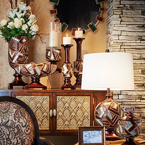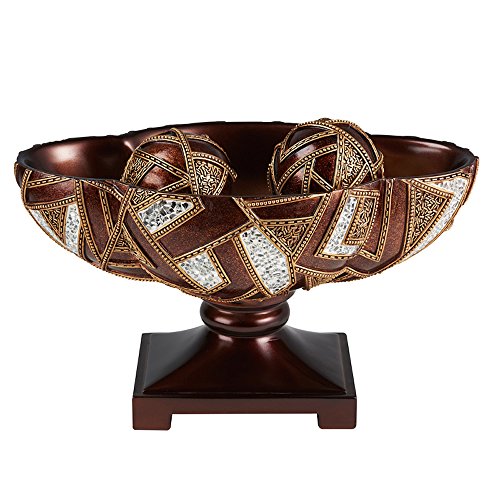 - The decorative bowls features geometric patterns of the Polymosaic between brown and gold lacquer finished ( bowl dimension is 15.75"L x 8.75"W x 10"H ; sphere diameter is 4.25"Dia )