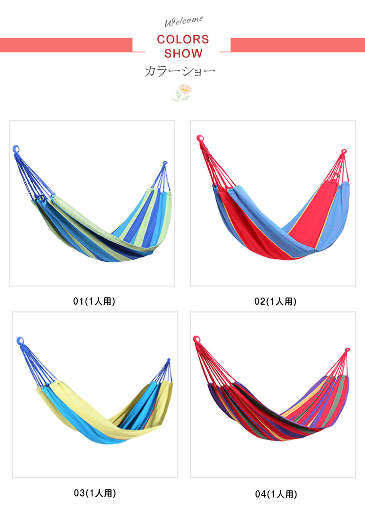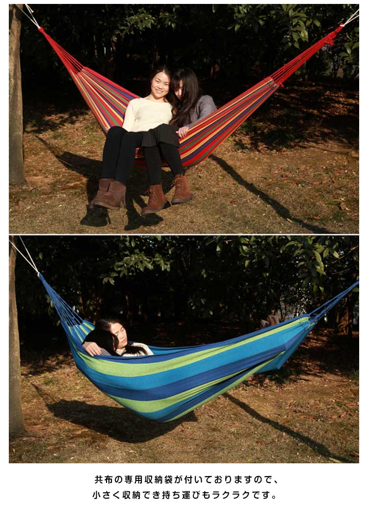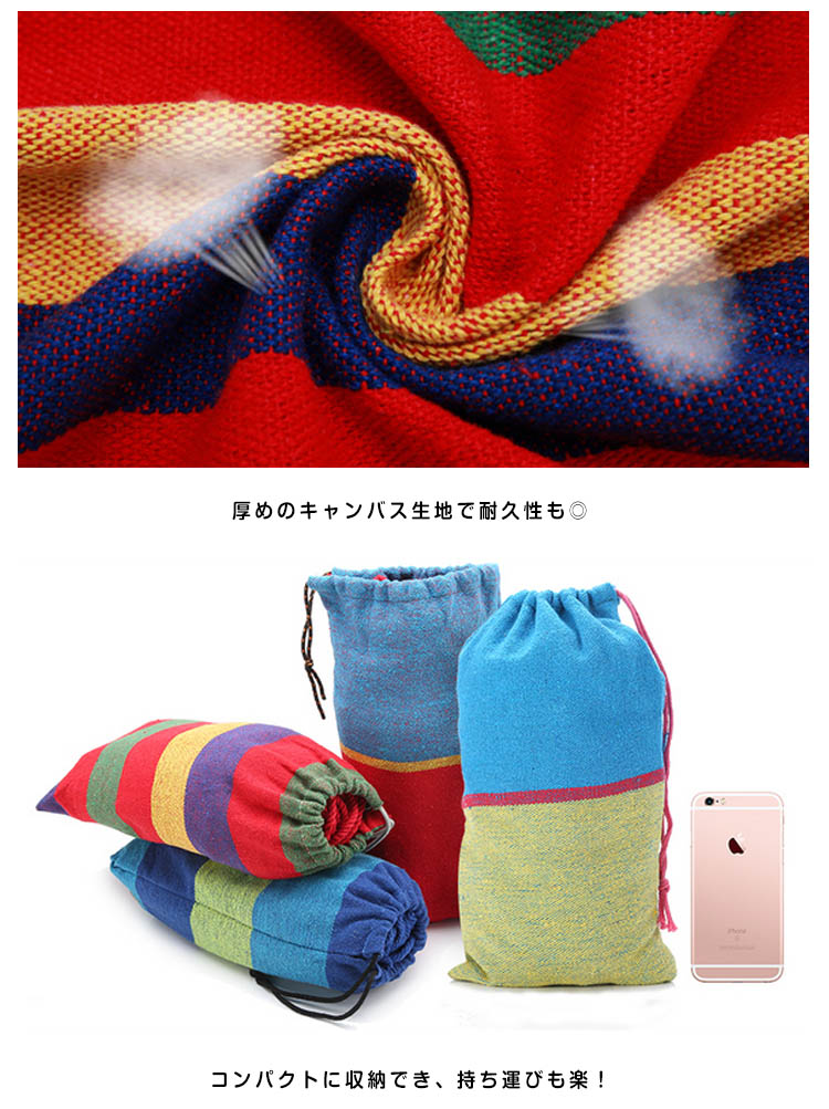 | 寝心地の良いキャンパス地ハンモックです。共布の専用収納袋が付いておりますので、小さく収納でき持ち運びもラクラクです。 キャンプや登山などのアウトドアでもハンモックがあれば楽しみが増える事間違いないです! | |