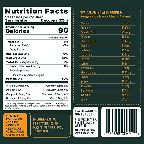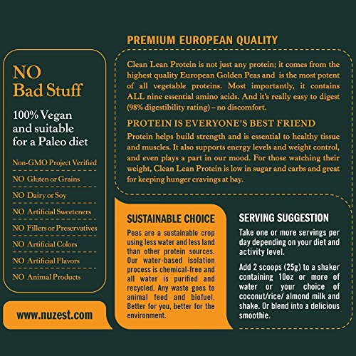CLEAN LEAN PROTEIN Clean Lean Protein from NuZest is the perfect alternative to whey. It's not only the worlds most potent vegetable protein (over 80% protein); it's easier to digest, very low in fat and (pea protein) is the only non-acidic protein available on the planet. The difference is all in the name: It's CLEAN Made from European Golden Peas grown in France and then blended in Belgium, it is subject to the high european quality and authenticity standards. It's GMO free, gluten free, dairy free, lectin free and soy free. We use a natural, water based isolation process that uses no organic solvents or hexane and results in a smooth, mild taste. It's LEAN Less that 1/2 gram of fat, 1/4 gram of naturally occurring sugar (no sugar added) and only 1 gram of carbs - Clean Lean Protein is one of the lowest fat, lowest carb, highest protein options on the market. With an average of 95 calories per serve and a high degree of satiety (keeps you feeling fuller for longer), Clean Lean Protein is great for weight management. PROTEIN With 20-22 grams of protein per serving (depending on flavor), Clean Lean Protein is one of the highest potency vegetable protein's on the market. It's a complete protein with ALL 9 essential amino acids + 9 of the non-essential aminos. Lastly, we sweeten it with protein, that's right, protein! We use Thaumatin (Katemfe Fruit Extract) which is a protein isolate from a West African Fruit. *These statements have not been evaluated by the Food and Drug Administration. This product is not intended to diagnose, treat, cure, or prevent any disease.Feature