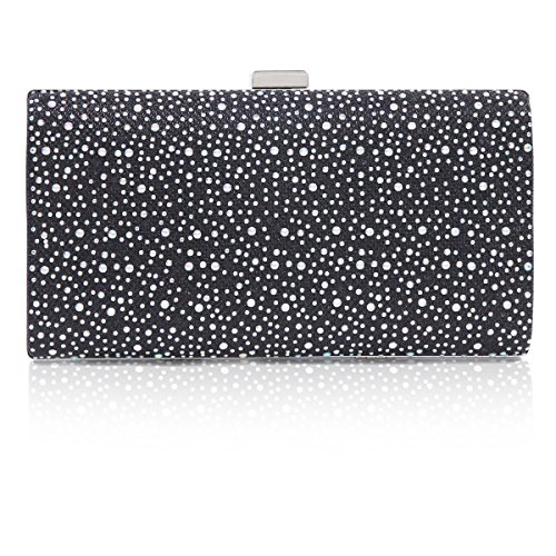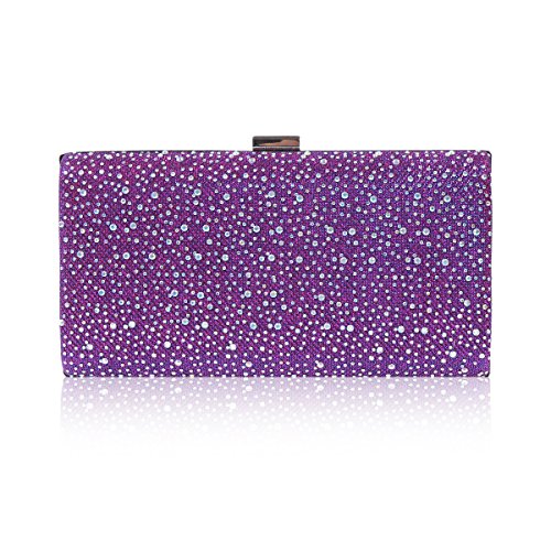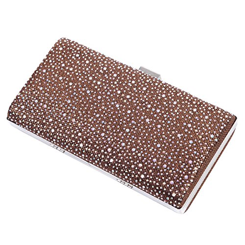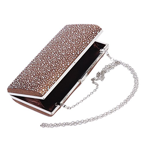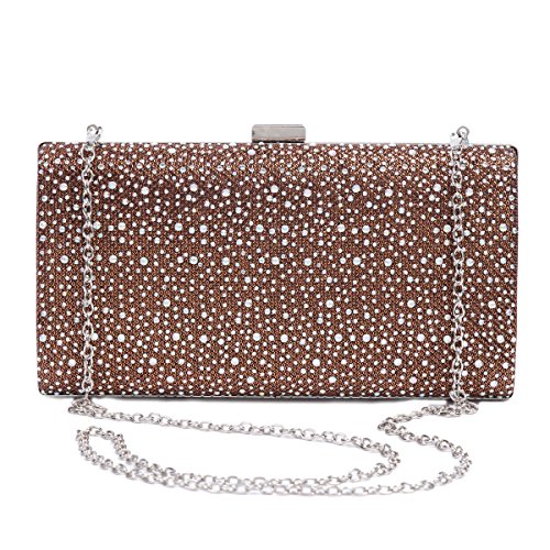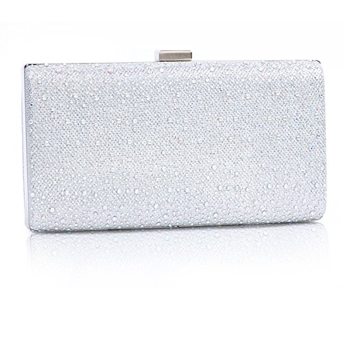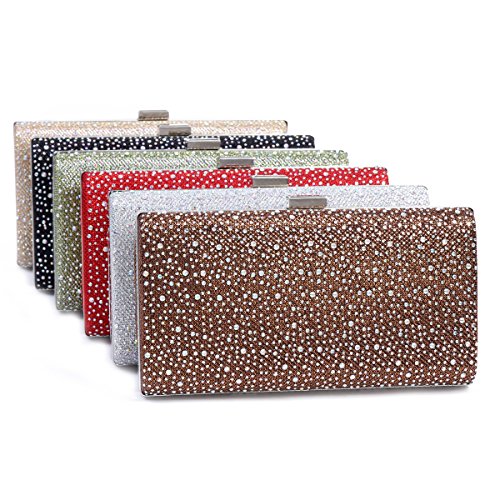 This sparkling women evening bag is made of gauze satin fabric. It features a metal hasp closure, a metal frame and all-over front rhinestones decoration. The glossy appearance make you more charming, distinguished and the focus of an evening party ,wedding party ,day clubs,cocktail party or prom .The interior offers just enough room for your most important items such as cellphone ,lipstick,invatation and other important receipt .A detachable silver chain is also available,which supplies versatile carrying options as a hand held clutch, tote, handbag, shoulder bag, or messenger bag.Feature