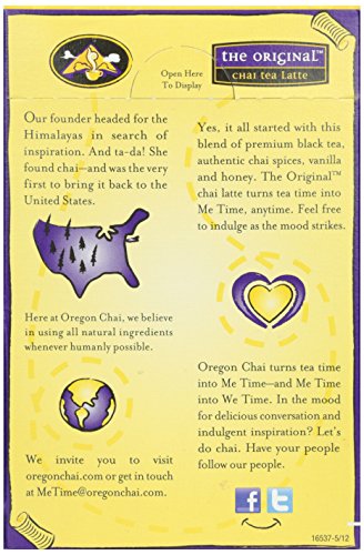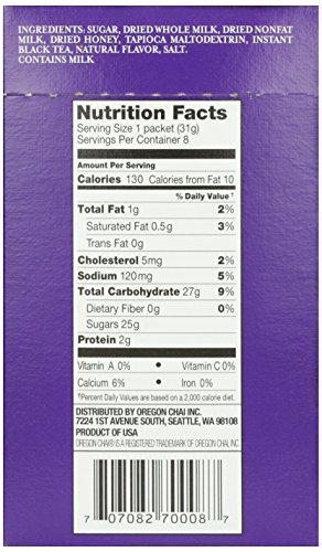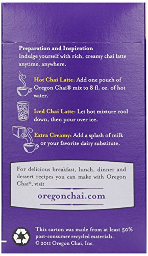 -. Binding : Grocery -. Brand : Oregon Chai -. EAN : 0707082700087 -. Feature : A chai latte craving may occur at any time. Be ready / Instant gratification. These portable mixes are pure (and simple) pleasure when you're on the go / To brew, just pour the contents of a single packet into your mug and add hot water / All natural; no preservatives; no additives / All of our packaging is made with over 50% recycled materials / Made more convenient, instant / All natural ingredients / Take it and make it anywhere -. Label : Oregon Chai -. Manufacturer : Oregon Chai -. Model : mburring -. MPN : 00077773 -. PackageQuantity : 1 -. PartNumber : 00077773 -. ProductGroup : Grocery -. ProductTypeName : GROCERY -. Publisher : Oregon Chai -. ReleaseDate : 2007-09-24 -. Studio : Oregon Chai -. Title : Oregon Chai Original Tea Latte Mix, 8 ct -. UPC : 707082700087