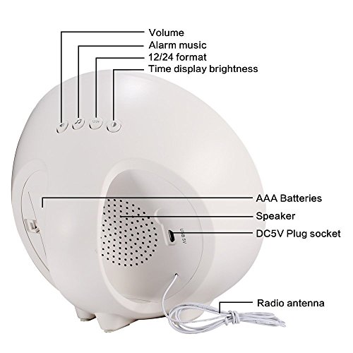 7 ALARM CLOCK SOUNDS AND SNOOZE FUNCTIONS: Press the button to choose the alarm sounds as your preference, alternating from 1 to 7. 1 – 6 6 natural sounds such as pure music, birds, waves,forest,DIDI and so on. 7 is FM radio.