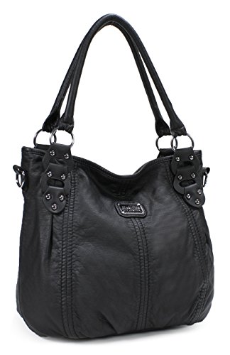-. Feature : Ultra soft synthetic washed leather with fabric lining. / Top zipper closure. Modern silver hardware. Two 7.5" rolled handles. / Interior cell phone pocket, multifunctional slip and side zipper pocket. Exterior back zipper pocket. / Removable and adjustable crossbody shoulder strap drops 25". / Size: 14"x11.5"x6.7"