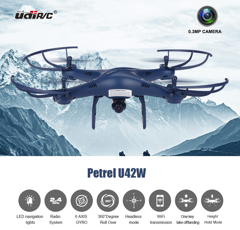 This UdiR/C U42W WIFI drone is equipped with 2.4G 4CH transmitter, 6-Axis gyro and barometer set height function for your easy and stable control, 0.3MP camera and WIFI real-time images transmission system for fantastic video/picturetaking, which is really a great flight combination. Moreover, it is fantastic with functions of high/low speed switch mode, flip mode, headless mode, altitude hold mode and one button take off/landing. Just come and get it!